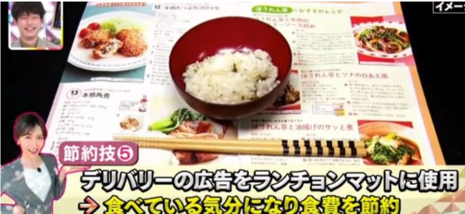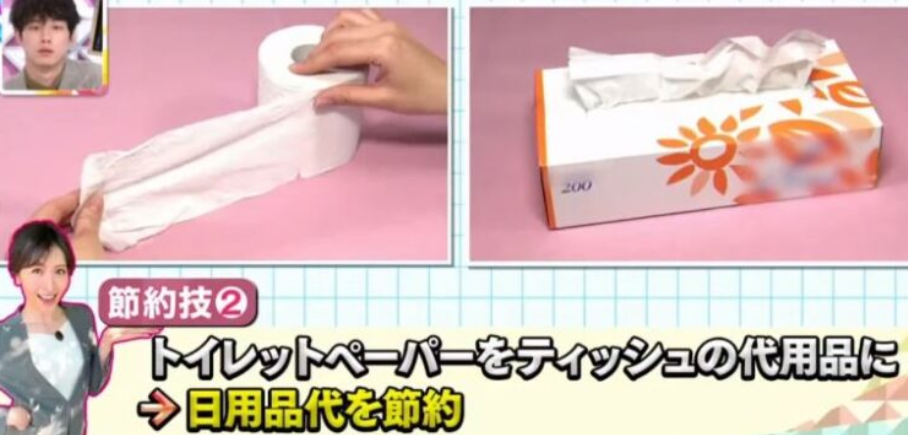 女性はティッシュ代を節約するため、トイレットペーパーを使用したり、デリバリーのチラシをランチョンマットにして「食べている気分」で食費節約。その他には、スーパーは余計なものを買わないように、常に素早くすまし会計前にカゴの中から「無くてもよさそうもの」を必ず1品戻す。調味料を使わずに納豆のタレで味付けする。