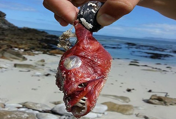 南アフリカのケープタウンの砂浜で観光客によって発見され、体のほとんどが口のようで、すごい牙が生えているこの魚。