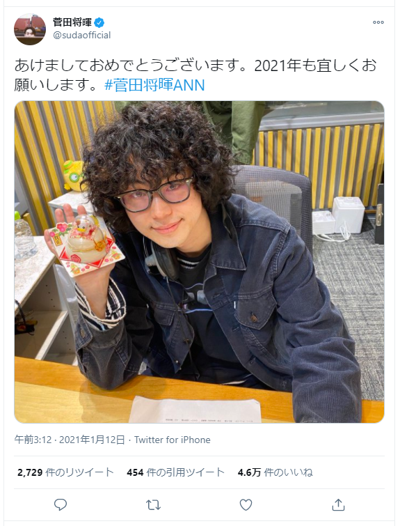 「#菅田将暉ANN」というハッシュタグを添えて《あけましておめでとうございます。2021年も宜しくお願いします》と挨拶。どうやら添付されている写真はラジオ番組『菅田将暉のオールナイトニッポン』(ニッポン放送)の収録風景のようで、2021年の初収録を伝えるツイートなのでしょう。