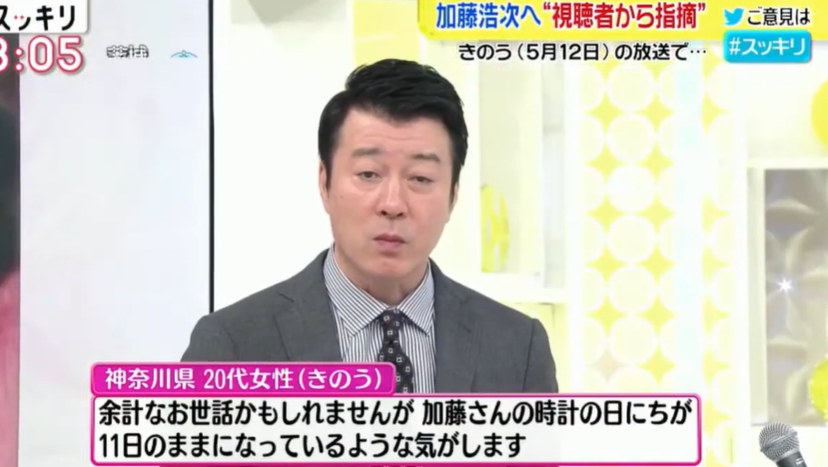 5月13日、日本テレビ系「スッキリ」で、司会を務める極楽とんぼの加藤浩次さんが、視聴者から思わぬ事を指摘され、生謝罪しました!