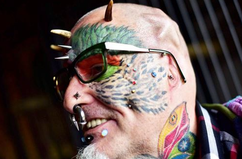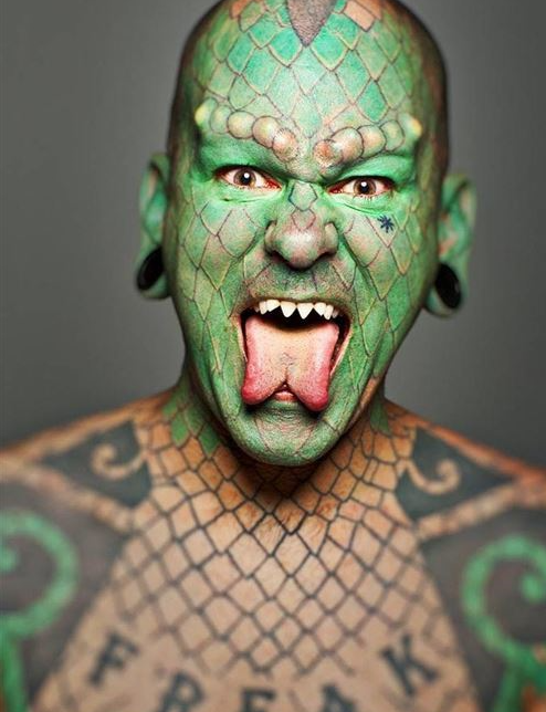 彼はトカゲに憧れたのか・・・・!?自分の見た目をトカゲのようにするため、体中を緑色のウロコ状タトゥーで覆い、舌を二又にしてしまいました。