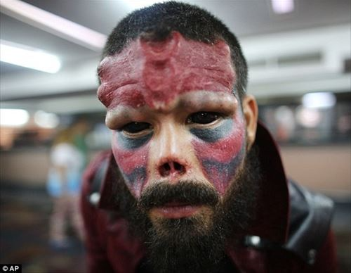 レッドスカルに近づくために彼は、額にインプラントを埋め込み、眼球を黒く染め、顔に赤色のタトゥーを彫り込み、そして鼻を削りました。