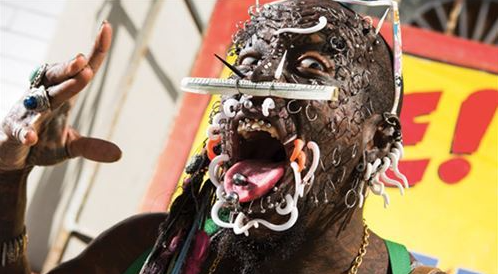 ヒタイや胸、腕、歯茎にチタンのこぶを埋め込み、眉毛全体、口、鼻、舌、耳たぶ、へそ、乳首に複数のピアスがあります。