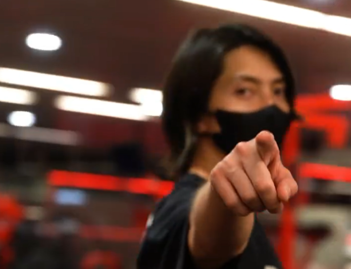 ジムにある筋トレ器具を使った5種類のトレーニング方法を実際に披露しました。最後はカメラを指差し、決めポーズを見せた山下さん。
