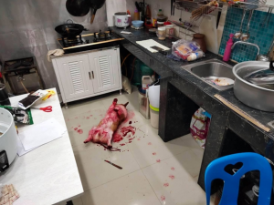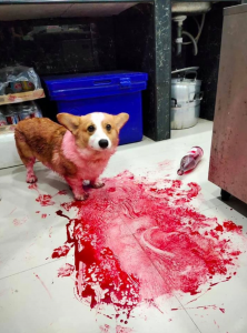 そしてAさんが台所に入った時、ひやりとしました。 厨房にはカルティエが動きなく血を流したまま仰向けになっており、近くには刃物が発見されたからです。 そしてAさんの見る角度では、カルティエの前足一つがないように見えました。