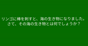 ”海の生き物とは何でしょうか” 問題文のある部分に注目してみましょう 今回ご紹介するのは脳トレクイズです。 問題 リンゴに棒を刺すと、海の生き物になりました。 さて、その海の生き物とは何でしょうか? Google ADVERTISEMENT Google あなたはわかりましたか? それでは答え合わせに行きましょう! Google 答えは、、、「サンゴ」 ADVERTISEMENT カタカナのリンゴのリに、横棒を一本加えてみましょう。すると、「サンゴ(珊瑚)」になりました。 Google ADVERTISEMENT あなたは間違えずに解けたでしょうか! Google [著作権者VONVON /無断コピー、無断転載および再配布禁止(違反時の法的措置) ADVERTISEMENT