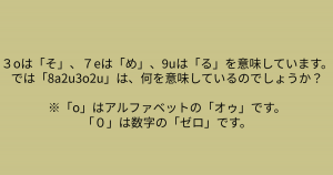 そのため、8aは「や」、2uは「く」、3oは「そ」を意味し、全て合わせて「約束(やくそく)」が答えになります。