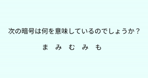 ”暗号は何を意味している?” ある部分に注目してみると答えが見えてくるかも? 今回ご紹介するのは脳トレクイズです。 問題 次の暗号は何を意味しているのでしょうか? ま み む み も Google ADVERTISEMENT Google あなたはわかりましたか? それでは答え合わせに行きましょう! Google 答えは、、、「女神」 ADVERTISEMENT 正しくは「まみむめも」ですが、問題文では「め」が「み」になっています。めがみだけに「女神」が暗号の答えになります。 ADVERTISEMENT Google あなたは間違えずに解けたでしょうか! Google [著作権者VONVON /無断コピー、無断転載および再配布禁止(違反時の法的措置) ADVERTISEMENT