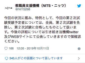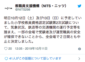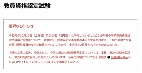 これは、教職員支援機構によると、一部の会場で受験者及び運営職員の安全が確保できないことが理由だそうですが、Twitterなどではこの決定について「いくらなんでもこの『特例』はないのでは。台風で試験を実施できないなら、普通は延期でしょう。。。」という意見が寄せられていました。