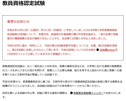 この日、教職員支援機構は、10月12日・13日に実施が予定していた「小学校教員資格認定試験第2次試験」について、気象状況や交通機関の運行予定などを踏まえ、全会場で2日間ともに試験を中止すると決定したほか、第2次試験予定者は全員合格とすると発表しました。