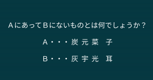 ”AにあってBにないものとは、、、” 問題文をよく読んで解いてみましょう 今回ご紹介するのは脳トレクイズです。 問題 AにあってBにないものとは何でしょうか? A・・・ 炭 元 菜 子 B・・・ 灰 宇 光 耳 Google ADVERTISEMENT Google あなたはわかりましたか? それでは答え合わせに行きましょう! Google 答えは、、、「おや」 ADVERTISEMENT Aの文字には、全て頭に「おや」がつきます。 おやすみ おやもと おやさい おやこ 以上より、答えは「おや」になります。 ADVERTISEMENT Google あなたは間違えずに解けたでしょうか! Google [著作権者VONVON /無断コピー、無断転載および再配布禁止(違反時の法的措置)] ADVERTISEMENT