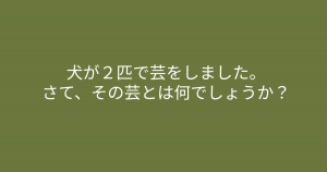 ”その芸とは何でしょうか?” 問題文をよくみると答えが見えてくるはず!? 今回ご紹介するのは脳トレクイズです。 問題 犬が2匹で芸をしました。 さて、その芸とは何でしょうか? Google ADVERTISEMENT Google あなたはわかりましたか? それでは答え合わせに行きましょう! Google 答えは、、、「けんけん」 ADVERTISEMENT 犬2匹を漢字で表すと「犬犬」です。犬犬だけに「けんけん」をしました。 けんけん・・・片足で飛び跳ねること。 ADVERTISEMENT Google あなたは間違えずに解けたでしょうか! Google [著作権者VONVON /無断コピー、無断転載および再配布禁止(違反時の法的措置) ADVERTISEMENT
