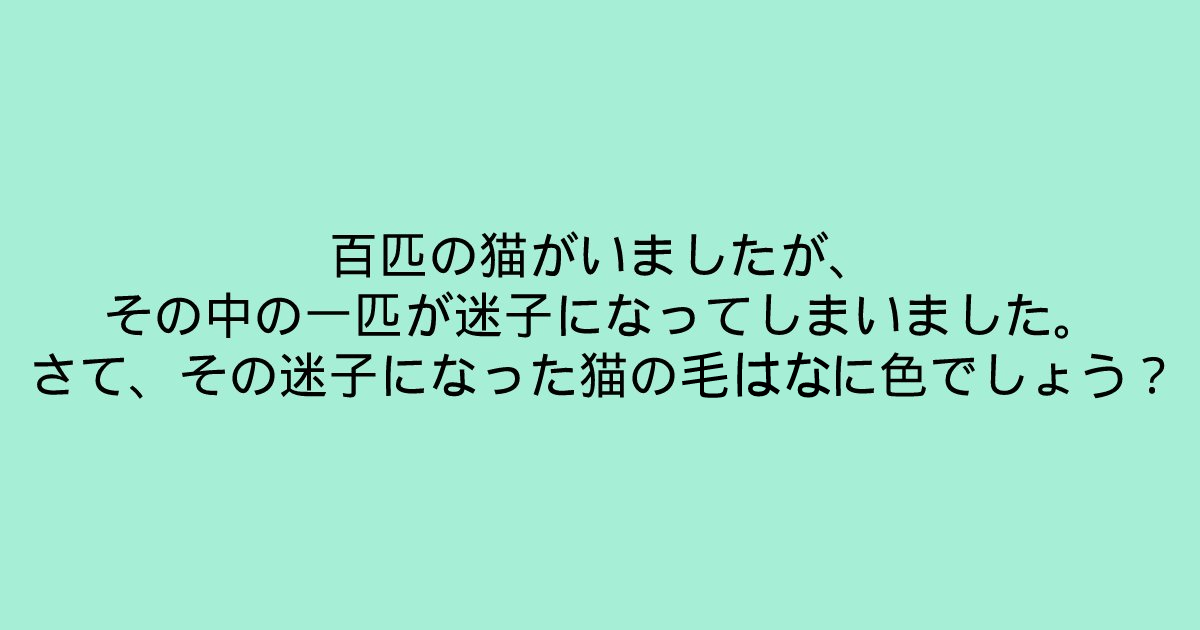 問題 : 百匹の猫がいましたが、その中の一匹がどこかに迷子になってしまいました。さて、その迷子になった猫の毛色は何色でしょうか?