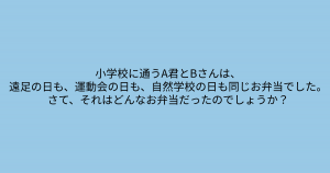 ”それはどんなお弁当、、、?” 問題文をよく読んで解いてみましょう 今回ご紹介するのは脳トレクイズです。 問題 小学校に通うA君とBさんは、遠足の日も、運動会の日も、自然学校の日も同じお弁当でした。 さて、それはどんなお弁当だったのでしょうか? Google ADVERTISEMENT Google あなたはわかりましたか? それでは答え合わせに行きましょう! Google 答えは、、、「サンドイッチ」 ADVERTISEMENT お弁当が「三度一致」したので、「サンドイッチ」が答えになります。 Google あなたは間違えずに解けたでしょうか! ADVERTISEMENT Google [著作権者VONVON /無断コピー、無断転載および再配布禁止(違反時の法的措置)]