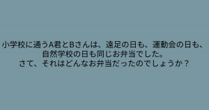 ”どんなお弁当だったのでしょうか?” 問題文のある部分に注目して解いてみましょう 今回ご紹介するのは脳トレクイズです。 問題 小学校に通うA君とBさんは、遠足の日も、運動会の日も、自然学校の日も同じお弁当でした。 さて、それはどんなお弁当だったのでしょうか? Google ADVERTISEMENT Google あなたはわかりましたか? それでは答え合わせに行きましょう! Google 答えは、、、「サンドイッチ」 ADVERTISEMENT お弁当が「三度一致」したので、「サンドイッチ」が答えになります。 Google あなたは間違えずに解けたでしょうか! ADVERTISEMENT Google [著作権者VONVON /無断コピー、無断転載および再配布禁止(違反時の法的措置)