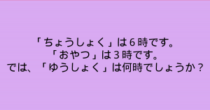 「おやつ」 ・・・ 3字なので3時同じように考えると、「ゆうしょく」は5字なので「5時」が答えになります。