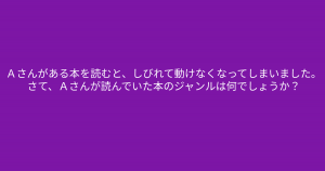 ”読んでいた本のジャンルは何でしょうか?” 問題文をよく読むとヒントが見つかるかも!? 今回ご紹介するのは脳トレクイズです。 問題 Aさんがある本を読むと、しびれて動けなくなってしまいました。 さて、Aさんが読んでいた本のジャンルは何でしょうか? Google ADVERTISEMENT Google あなたはわかりましたか? それでは答え合わせに行きましょう! Google 答えは、、、「伝記」 ADVERTISEMENT 「伝記」を読むと、伝記だけに「電気」が走ってしびれてしまいました。 Google あなたは間違えずに解けたでしょうか! ADVERTISEMENT Google [著作権者VONVON /無断コピー、無断転載および再配布禁止(違反時の法的措置)