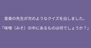 ”味噌(みそ)の中にあるものは、、、” 簡単そうで意外と難しいクイズに大人も挑戦! 今回ご紹介するのは脳トレクイズです。 問題 音楽の先生が次のようなクイズを出しました。 「味噌(みそ)の中にあるものは何でしょうか?」 Google ADVERTISEMENT Google あなたはわかりましたか? それでは答え合わせに行きましょう! Google 答えは、、、「ファ」 ADVERTISEMENT 音楽といえば、ドレミの音階です。ドレミの音階で、「ミ」と「ソ」の間にあるのは「ファ」になります。ドレミファソラシド ADVERTISEMENT Google あなたは間違えずに解けたでしょうか! Google [著作権者VONVON /無断コピー、無断転載および再配布禁止(違反時の法的措置)] ADVERTISEMENT