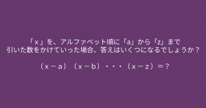 「x」を、アルファベット順に「a」から「z」まで引いた数をかけていった場合、答えはいくつになるでしょうか?