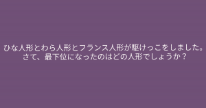 ”最下位になったのはどの人形でしょう” 問題文をよく読んで解いてみましょう! 今回ご紹介するのは脳トレクイズです。 問題 ひな人形とわら人形とフランス人形が駆けっこをしました。 さて、最下位になったのはどの人形でしょうか? Google ADVERTISEMENT Google あなたはわかりましたか? それでは答え合わせに行きましょう! Google 答えは、、、「わら人形」 ADVERTISEMENT わら人形は「呪い」をかけます。呪いだけに、足が「鈍のろい」のです。 Google あなたは間違えずに解けたでしょうか! ADVERTISEMENT Google [著作権者VONVON /無断コピー、無断転載および再配布禁止(違反時の法的措置)