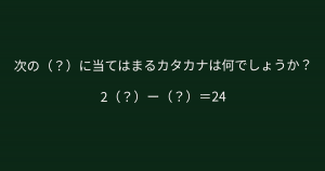 ”(?)に当てはまるカタカナは?” 頭の回転が速い人にしか解けない問題! 今回ご紹介するのは脳トレクイズです。 問題 次の(?)に当てはまるカタカナは何でしょうか? 2(?)ー(?)=24 Google ADVERTISEMENT Google あなたはわかりましたか? それでは答え合わせに行きましょう! Google 答えは、、、「ダ ス(2ダース=24)」 ADVERTISEMENT 1ダースは12なので、「2ダース=24」になります。 Google あなたは間違えずに解けたでしょうか! ADVERTISEMENT Google [著作権者VONVON /無断コピー、無断転載および再配布禁止(違反時の法的措置)