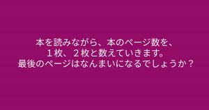 「本を読みながら、本のページ数を、1枚、2枚と数えていきます。」柔軟な考えができる人には簡単な問題! 今回ご紹介するのは脳トレクイズです。 問題 : 本を読みながら、本のページ数を、1枚、2枚と数えていきます。 最後のページはなんまいになるでしょうか? Google ADVERTISEMENT Google あなたはわかりましたか? それでは答え合わせに行きましょう! Google 答えは、、、「おしまい」 ADVERTISEMENT 最後のページということは、つまり「本を読み終えた」ということです。 本を読み終えたらその本は「おしまい」になります。 ADVERTISEMENT Google あなたは間違えずに解けたでしょうか! Google [著作権者VONVON /無断コピー、無断転載および再配布禁止(違反時の法的措置) ADVERTISEMENT