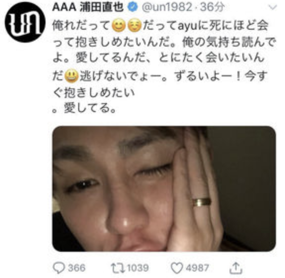 「文句あるなら、彼女の前と俺の前に美貌を持って文句言って来てね!アユ姉をぶすと言った人たちどんかひがびっても横に並んだらayuの可愛さにひかれるよ!」と、昨今の浜崎さんへのバッシングを連想させるような文章をツイートし「ayu姉超えたら俺が、なんかしたるわ!まじないかな。勝てると思うなら来い」と挑発もをしていました。