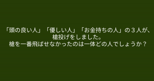 ”槍を一番飛ばせなかったのは一体どの人でしょうか?” これが解けない人は頭が硬いかも、、、? 今回ご紹介するのは脳トレクイズです。 問題 「頭の良い人」「優しい人」「お金持ちの人」の3人が、槍投げをしました。 槍を一番飛ばせなかったのは一体どの人でしょうか? Google ADVERTISEMENT Google あなたはわかりましたか? それでは答え合わせに行きましょう! Google 答えは、、、「優しい人」 ADVERTISEMENT 優しい人は「思いやり」があります。思いやりだけに、「重い槍」でしたので、遠くまで飛ばすことができませんでした。 ADVERTISEMENT Google あなたは間違えずに解けたでしょうか! Google [著作権者VONVON /無断コピー、無断転載および再配布禁止(違反時の法的措置) ADVERTISEMENT