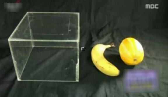 密閉された箱の中に果物を入れる。そして、24時間経過後に箱の中に発生したコバエ。