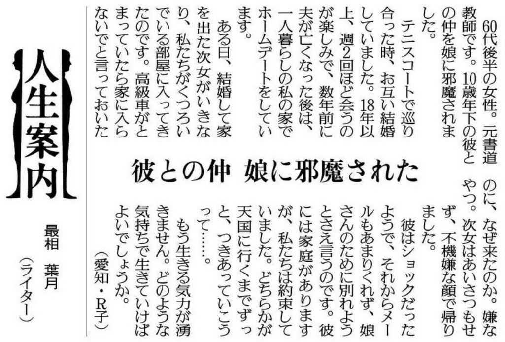 今日ご紹介するのはちょっと理解し難い年配女性の恋愛模様です。恋に一直線のこの女性は娘さんの存在が目障りのようです。一体どんな話が待っているのでしょうか。詳しく見ていきましょう。