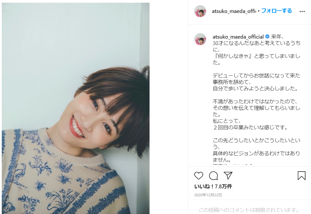 昨年末、2020年12月31日をもって 元AKB48の前田敦子さんが、所属していた太田プロダクションを退社し フリーとなりました 。同じくフリーで活動する女優・満島ひかりさんのスタッフにサポートを依頼したと 1月5日発売の『女性セブン』(小学館)でも 報じられていますが…。