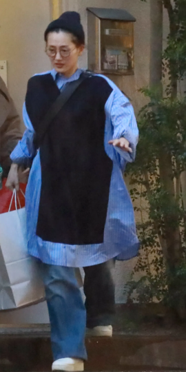 「くすみブルーのトップスに、グレーのワイドパンツ、黒のアウター、白のスニーカーブーツという落ち着いたカジュアルスタイル。季節柄、首元にはグレーのマフラー、頭には黒のニット帽をかぶっています。ニット帽からは、つるんとしたおでこがお目見えしており、目元には丸メガネが。撮影終わりなのか、しっかり防寒されており、来日した彼と久しぶりに会うときのコーデではなさそうな雰囲気です」(芸能ライター)