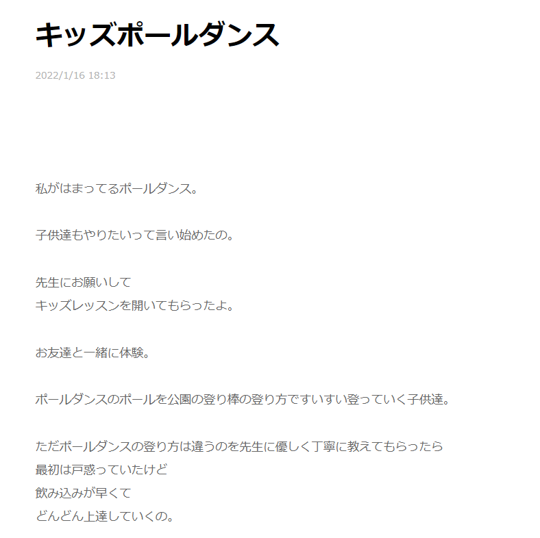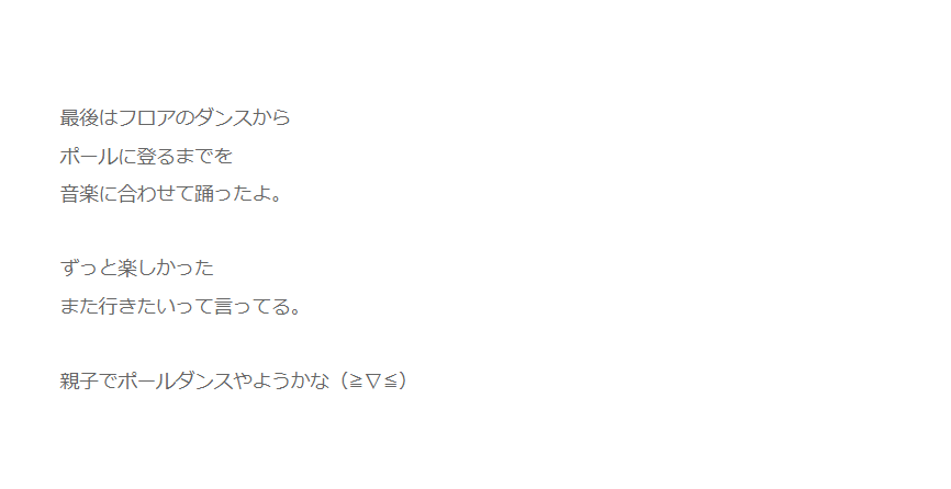友だちと一緒に体験したといい、「ポールダンスのポールを公園の登り棒の登り方ですいすい登っていく子供達。ただポールダンスの登り方は違うのを先生に優しく丁寧に教えてもらったら最初は戸惑っていたけど 飲み込みが早くてどんどん上達していくの。子供達は体が柔らかいし 体重も軽いし 先生の言葉を素直に聞いてくれるから すごいスピードで出来るようになっていくよ」とポールに登る子どもたちの写真をアップ。「最後はフロアのダンスから ポールに登るまでを音楽に合わせて踊ったよ。ずっと楽しかった また行きたいって言ってる。親子でポールダンスやろうかな」とコメントしました。