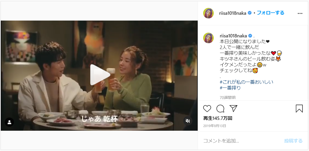 2013年に奥さん(女優の仲里依紗さん)と結婚し、2014年に長男が誕生した中尾さん。お互いのインスタでも、仲睦まじいツーショット写真も多いものの、CM初共演は 2019年。キリンの「一番搾り」のCMに出演している2人の姿をインスタに公開し報告した際には…