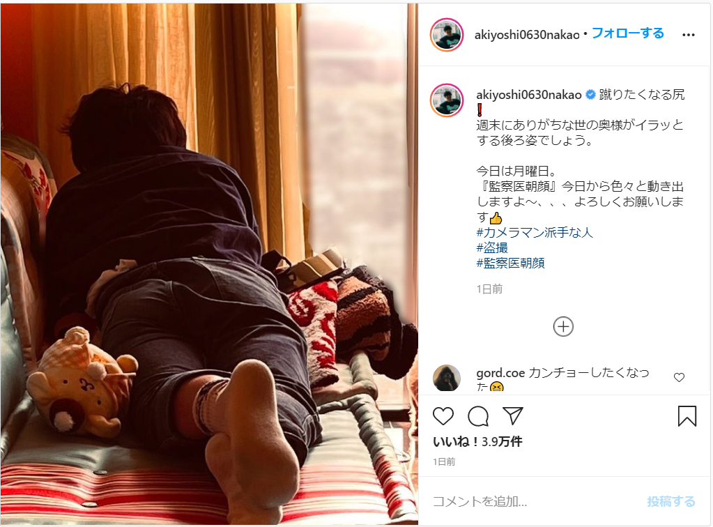 「週末にありがちな世の奥様がイラッとする後ろ姿でしょう」とつづりつつ、中尾さんは 併せて「#カメラマン派手な人」「#盗撮」などと妻で女優の仲里依紗さんが撮影したと思わせるようなハッシュタグも添えていたのでした。