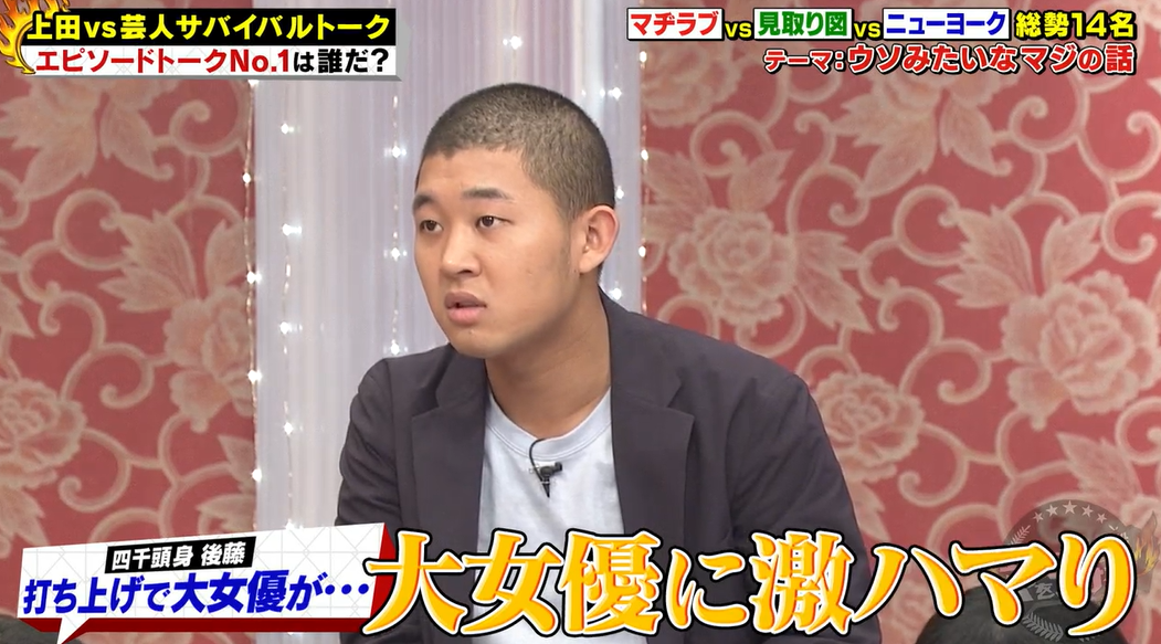 お笑いトリオ・四千頭身の後藤拓実(24)が、10日に放送されたフジテレビ系バラエティ番組「芸人サバイバルトーク!上田に火をつけろ」に出演。番組の打ち上げの場でベタベタしてきた“女優”を暴露しました。