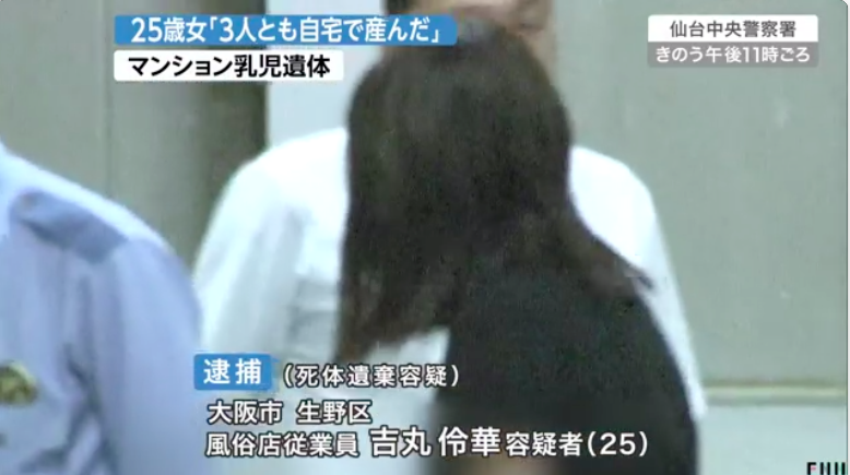 過去に住んでいた自宅に乳児の遺体を遺棄したとして、宮城県警仙台中央署は23日、死体遺棄の疑いで大阪市生野区巽南、風俗店従業員、吉丸伶華容疑者(25)を逮捕した。部屋には他に2人分の乳児とみられる遺体があり、関連を調べている。