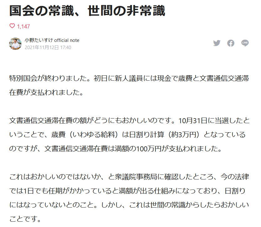 まず、こちらをご覧ください。10月31日に当選したばかりの衆院議員小野たいすけ氏のブログです。