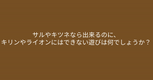 「サルやキツネなら出来るのに、キリンやライオンにはできない遊びは何でしょうか?」共通点を見つけると正解に近づけるかも! 今回ご紹介するのは脳トレクイズです。 問題 :サルやキツネなら出来るのに、キリンやライオンにはできない遊びは何でしょうか? Google ADVERTISEMENT Google あなたはわかりましたか? それでは答え合わせに行きましょう! Google 答えは、、、「しりとり」 ADVERTISEMENT 「しりとり」は、「ん」で終わる単語を言ってしまうと負けになります。キリンやライオンは「ん」で終わる名前だけに、しりとりをすることができませんでした。 ADVERTISEMENT Google あなたは間違えずに解けたでしょうか! Google [著作権者VONVON /無断コピー、無断転載および再配布禁止(違反時の法的措置) ADVERTISEMENT