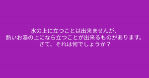 ”水の上に立つことは出来ませんが、、、” ある部分に注目して解いてみましょう 今回ご紹介するのは脳トレクイズです。 問題 水の上に立つことは出来ませんが、熱いお湯の上になら立つことが出来るものがあります。 さて、それは何でしょうか? Google ADVERTISEMENT Google あなたはわかりましたか? それでは答え合わせに行きましょう! Google 答えは、、、「湯気」 ADVERTISEMENT お湯が沸騰していると白い蒸気が出ます。このことを「湯気が立つ」と言います。答えはこの「湯気」になります。 ADVERTISEMENT Google あなたは間違えずに解けたでしょうか! Google [著作権者VONVON /無断コピー、無断転載および再配布禁止(違反時の法的措置)] ADVERTISEMENT