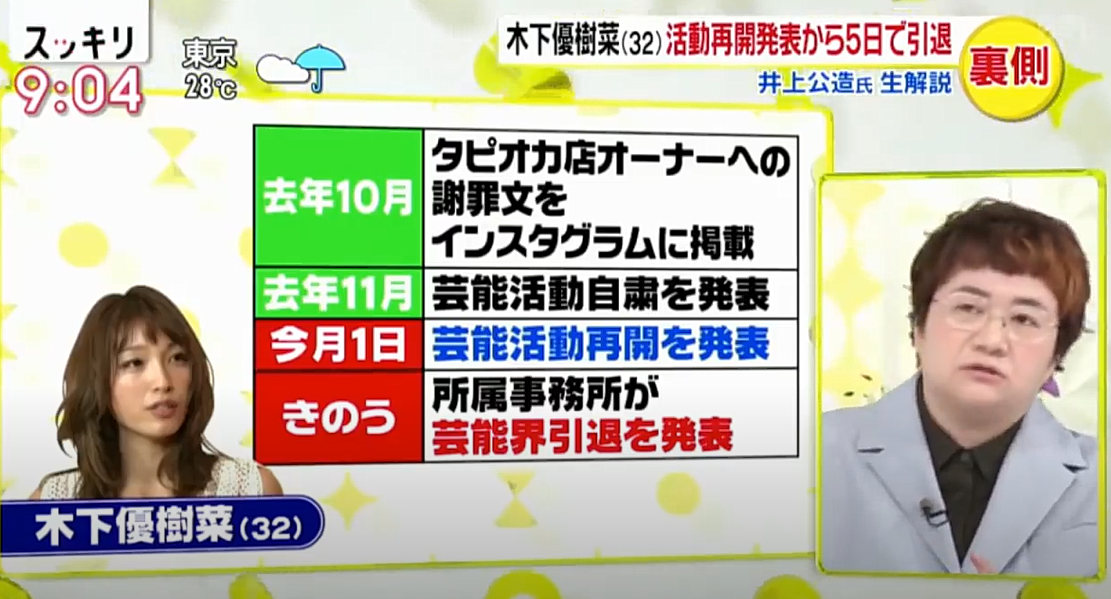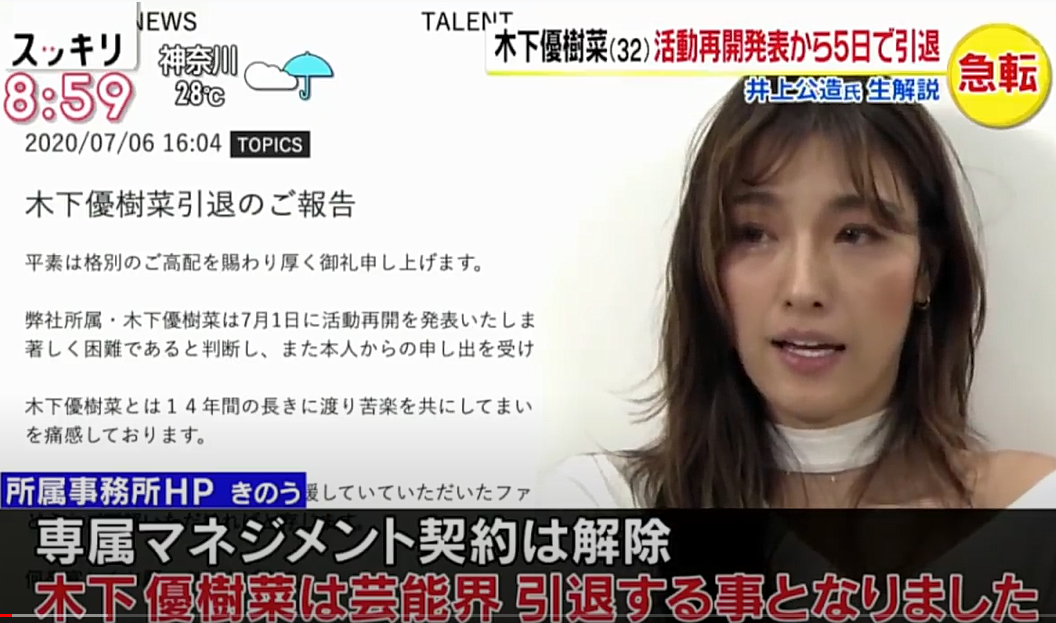 〝事務所総出〟で 一般人に危害を加えようとする反社会的勢力顔負けの言動が引き金となり、昨年秋から 芸能活動を休止していた木下さん。7月1日には 事務所公式サイトとインスタグラムで活動再開を表明していたのですが、急転直下の引退宣言で 芸能界にも衝撃が走っっているようでした。