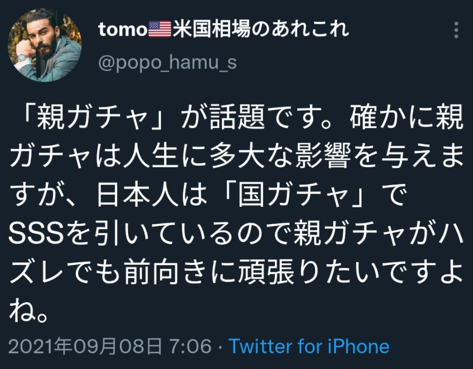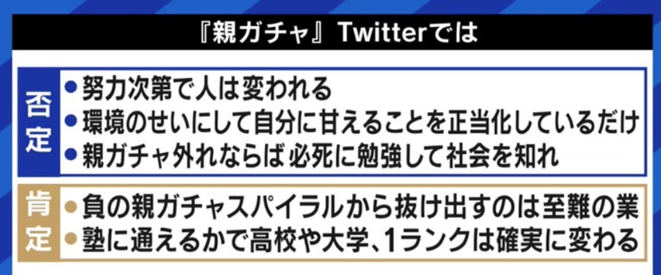 《親ガチャ》若者の間で今話題となっている、この言葉。いわゆるネットスラングであり、「ガチャガチャ」になぞらえて「子供は親を選ぶことはできす、どういう境遇に生まれるかは運任せ」というような意味を持っているようです。
