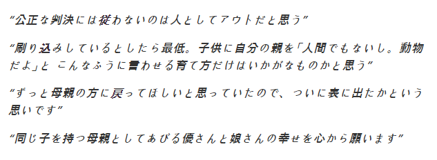 離婚は親の都合でしたこと。何も悪くない子供を争いに巻き込まず、これ以上傷つけないようにしていただきたいです。
