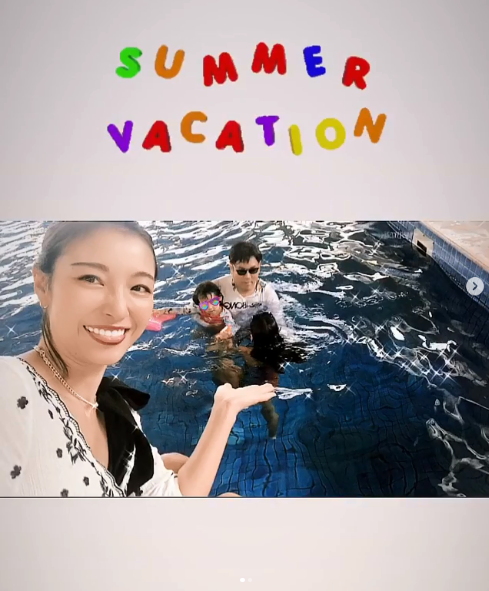 また、別の日に投稿したinstagramでは、プールで遊ぶ家族の写真を投稿した木下優樹菜。夫であるフジモンこと藤原敏史と二人の娘たちがプールで遊んでいる傍ら、どうやら本人は入らなかったようで、そのままプールサイドで見守っていたようです。