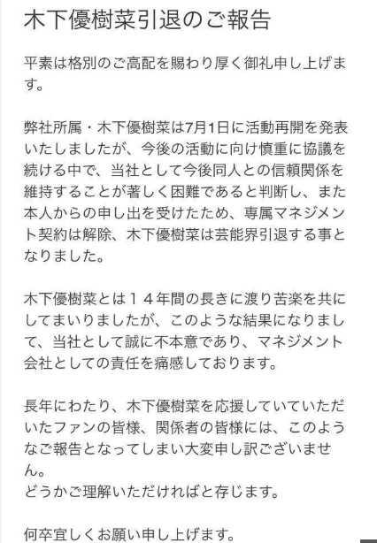 「弊社所属・木下優樹菜は7月1日に活動再開を発表いたしましたが、今後の活動に向け慎重に協議を続ける中で、当社として今後同人との信頼関係を維持することが著しく困難であると判断し、また本人からの申し出を受けたため、専属マネジメント契約は解除、木下優樹菜は芸能界引退する事となりました」