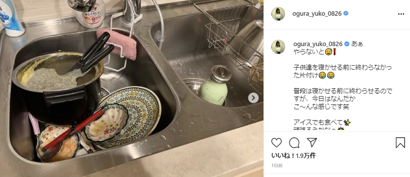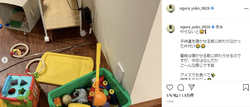 小倉さんは、前日の夜に2枚の写真を投稿し、「あぁやらないと! 子供達を寝かせる前に終わらなかった片付け 普段は寝かせる前に終わらせるのですが、今日はなんだかこ~んな感じです笑」とつづりました。