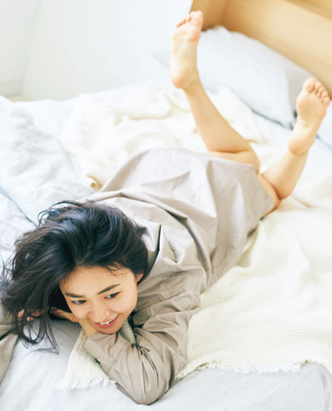 「〝等身大感〟を演出するために、ナチュラルメークで裸足という姿にしたのでしょうが、かえって老けて見えてしまっています。髪をルーズにしたことも逆効果。何とも〝疲労感〟漂う1枚となってしまっています」―ファッション誌編集者