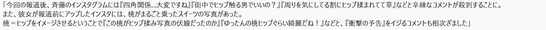 ドロ沼の四角関係スキャンダルで世間に衝撃を与えただけではなく、文春が掴んだ斉藤とサラリーマンのデート写真が大波乱を呼んでいるのです。